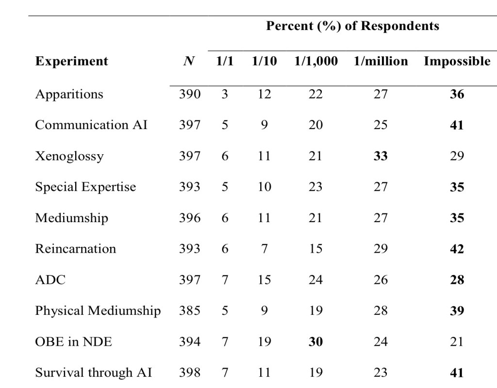 In general, most did not think that the proposed experiments would be completed with positive outcomes. The proposed experiments were chosen based on the existing evidence for the survival of consciousness. Overall, the experiments were selected as plausible, and we did not exclude experiments that may be challenging to undertake given current technologies. This choice may partly explain the low likelihood ratings. Thus, these results are not completely unexpected, given that the prospective systematic study of the nature of consciousness is still a growing field.